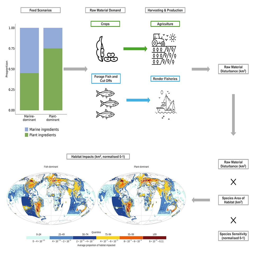 Este estudio evaluó los impactos en la biodiversidad, en forma de pérdida de hábitat, de 54.628 especies marinas y terrestres para dos alimentos simplificados pero plausibles para el salmón del Atlántico. Los resultados mostraron un impacto generalizado tanto en especies marinas (∼89 por ciento) como terrestres (∼71 por ciento), si bien la magnitud promedio del impacto es pequeña. A pesar de la necesidad de minimizar el uso de harina y aceite de pescado de origen silvestre, la mayor dependencia en la agricultura para el suministro de alimentos parece haber incrementado desproporcionadamente los impactos en los taxones terrestres. Los resultados proporcionan información clave para la selección de alimentos acuícolas con el fin de minimizar los impactos y optimizar la sostenibilidad. A medida que la industria acuícola se expande para alimentar a miles de millones de personas más, un enfoque estandarizado para evaluar los efectos de los alimentos en la biodiversidad global resulta esencial para la toma de decisiones informadas.