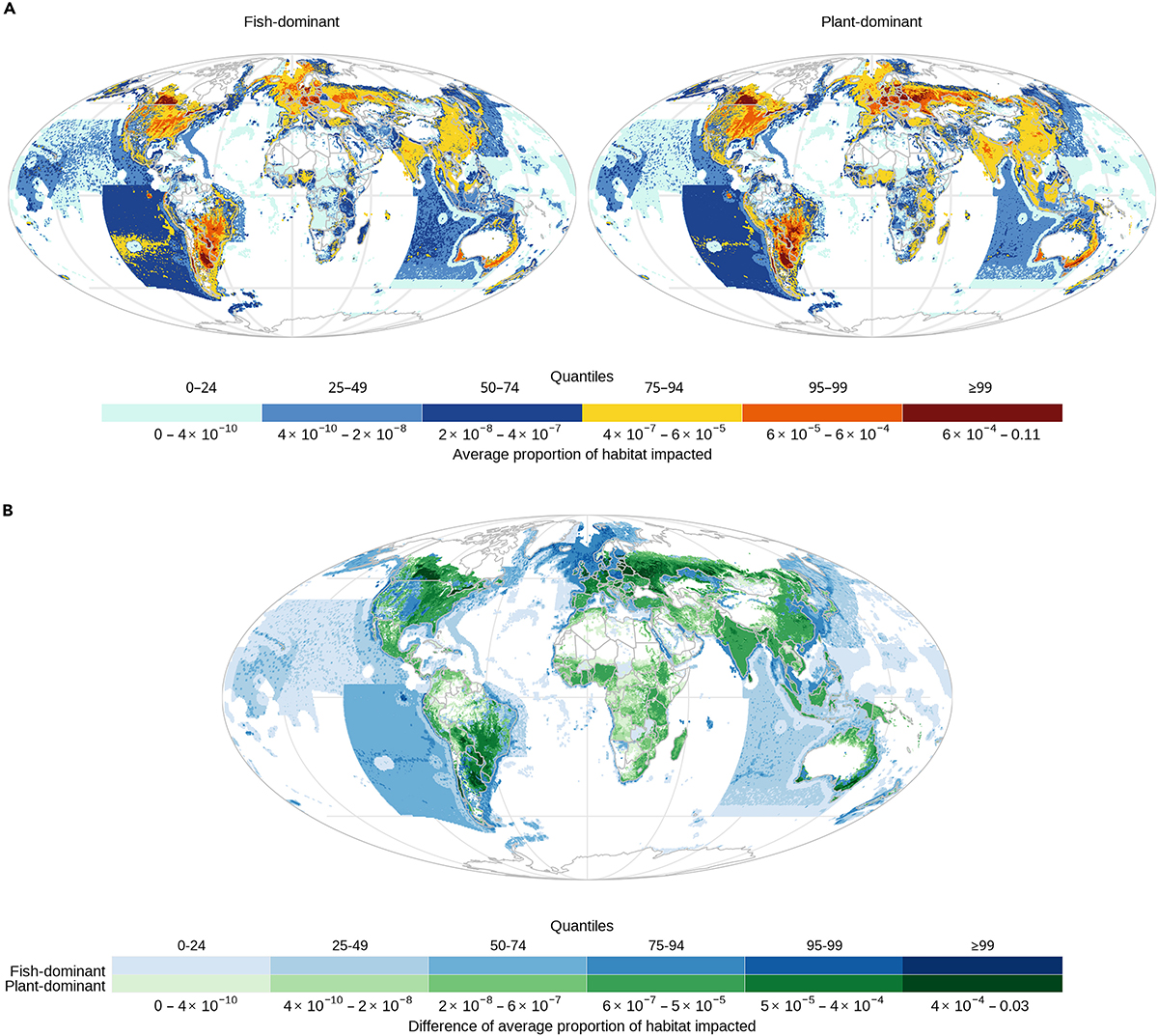 Además, las diferencias en la proporción media de hábitat afectado por celda son mayores en tierra que en el océano en ambos escenarios. Los impactos terrestres promedio del escenario con predominio de peces son aproximadamente 12,8 veces mayores que sus impactos oceánicos, mientras que los impactos terrestres del escenario con predominio de plantas son 36,7 veces mayores que sus impactos oceánicos. El escenario con predominio de peces tiene un impacto promedio en el océano aproximadamente 1,4 veces mayor que el escenario con predominio de plantas, mientras que este último impacta los hábitats terrestres más del doble que el primero (aproximadamente 2,04 veces más). Por lo tanto, en general, una mayor dependencia de la agricultura para el suministro de alimento parece haber amplificado los impactos en los taxones terrestres.